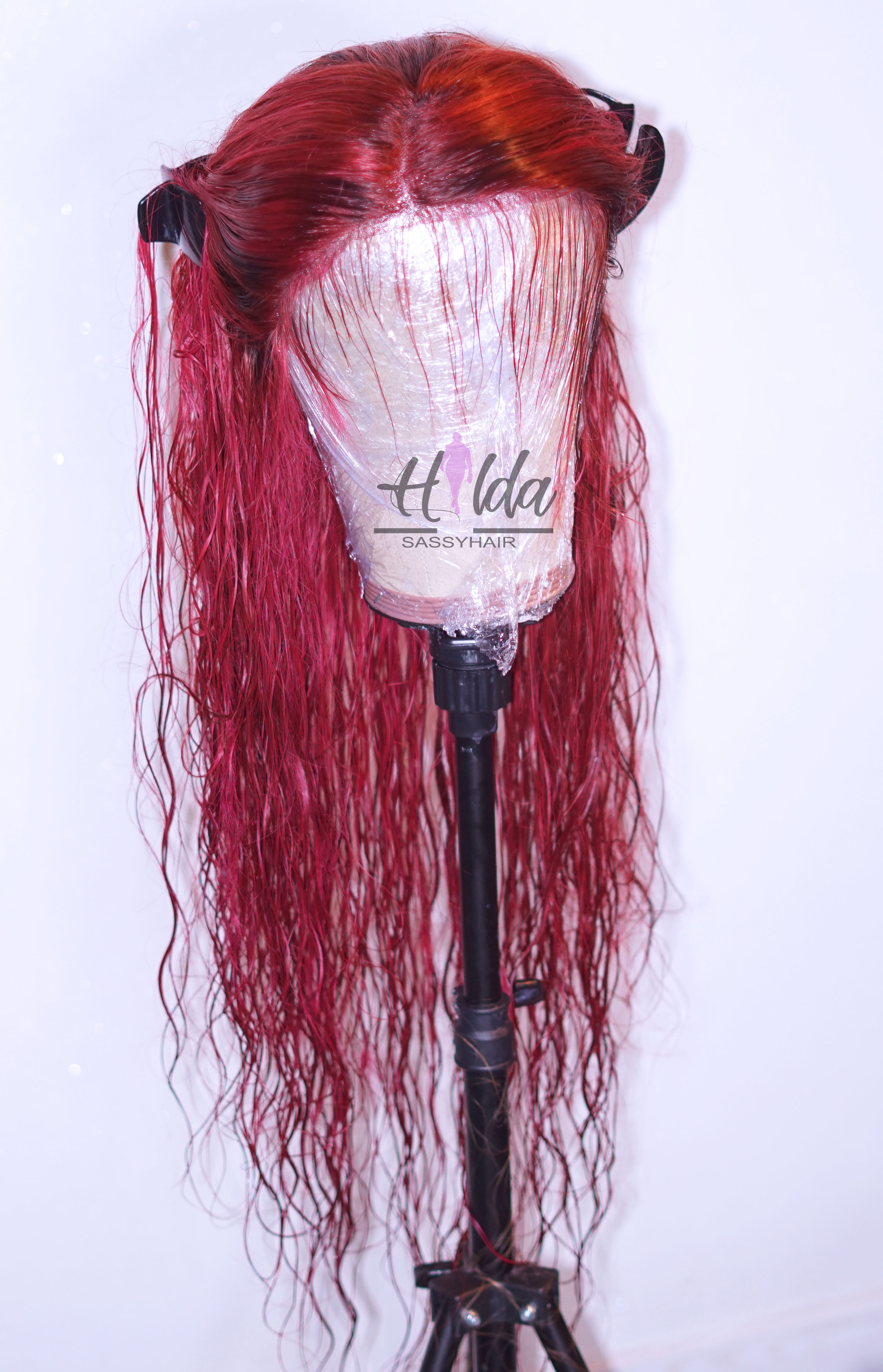 This is a wig made with a straight natural hair color and dyed into burgundy.